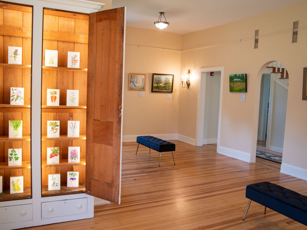 The interior of the cabinet illuminates pieces portraying magnolias, chamomile, and even Joseph’s favorite, artichokes, in collaboration with the Garden State Watercolor Society.