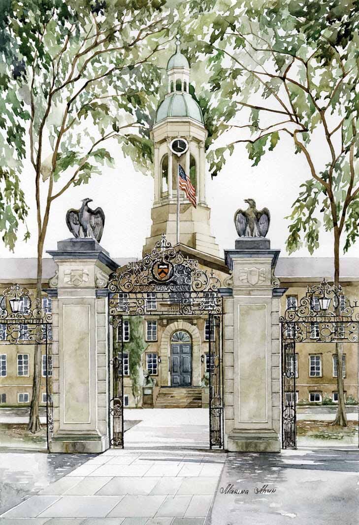 Marina Ahun is a Princeton-based artist known in part for her watercolors that explore the architecture of Princeton, Trenton, and New York City. She was born in Soviet Russia, studied at the Imperial Academy of fine Arts in St. Petersburg, and is the licensed and commissioned artist for Princeton University.