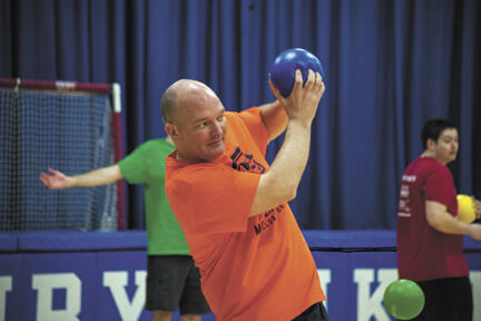 Aguilar is now one of roughly 25 people who get together every Wednesday to play dodgeball. As he plays, his wife and son are in the crowd cheering him on to show their support.