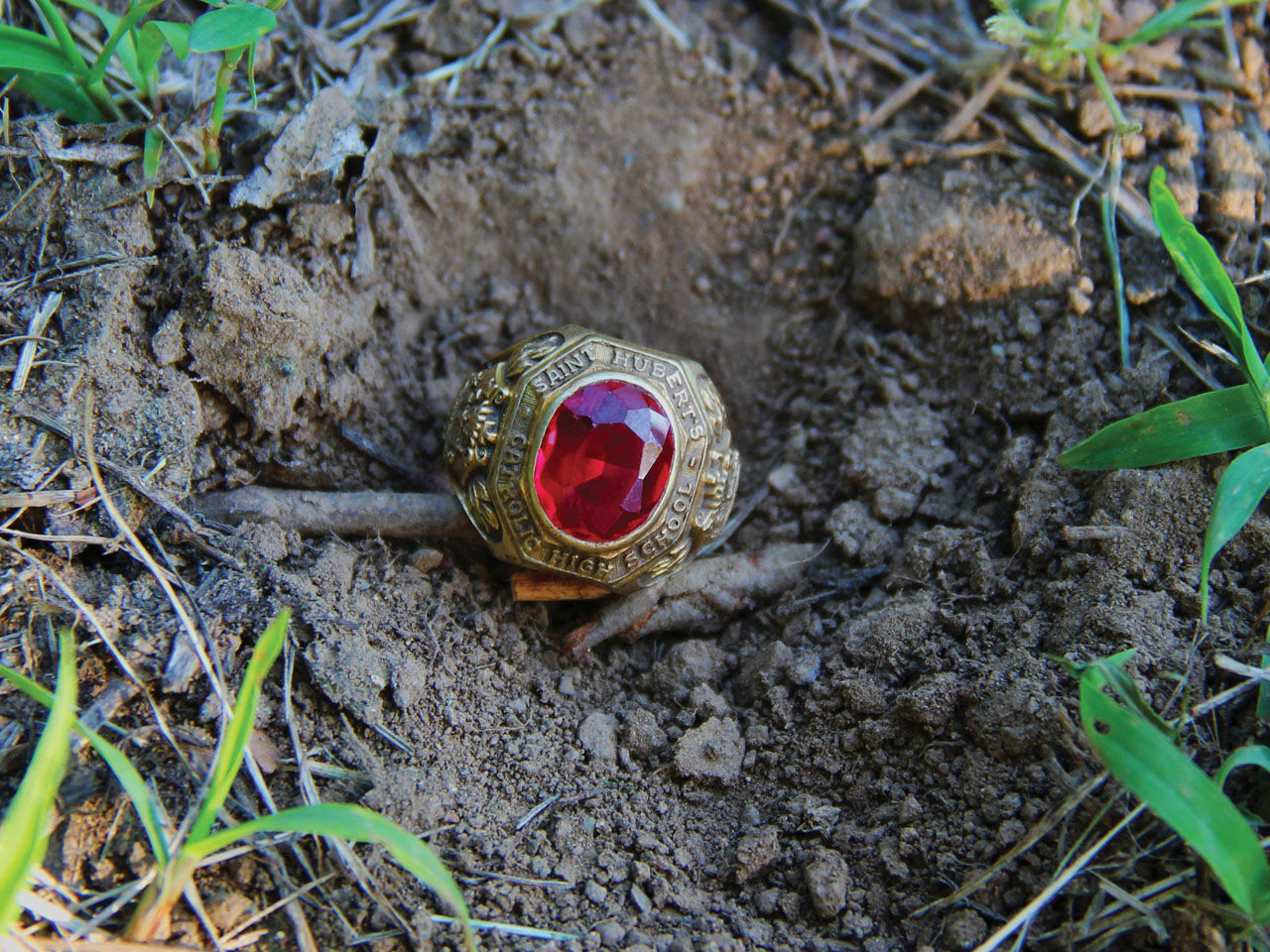 Picking up a sharp stone, I dug all around the gold bit and tried to pull it out, but it wouldn’t budge. Digging down farther, I uncovered a clear, red stone. I had found a class ring—and a tree root was growing through it!