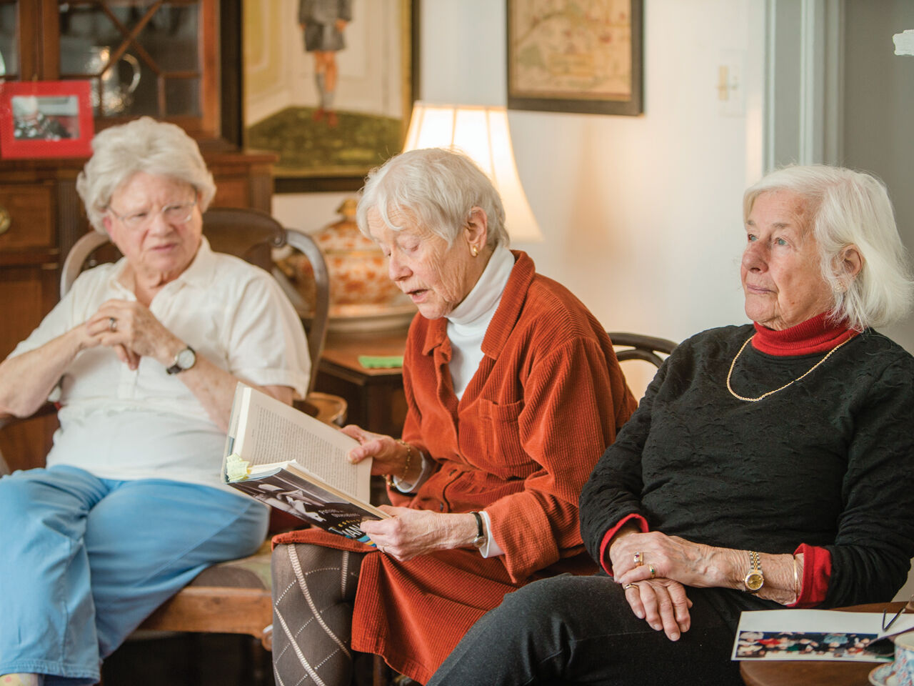 Barbara Griffin, left, Willa Stackpole, and Marianne Grey. The group typically reads aloud from a book; at this meeting, however, the focus was a Vanity Fair article: ‘Inside Quebec’s Great, Multi-Million-Dollar Maple Syrup Heist.’,