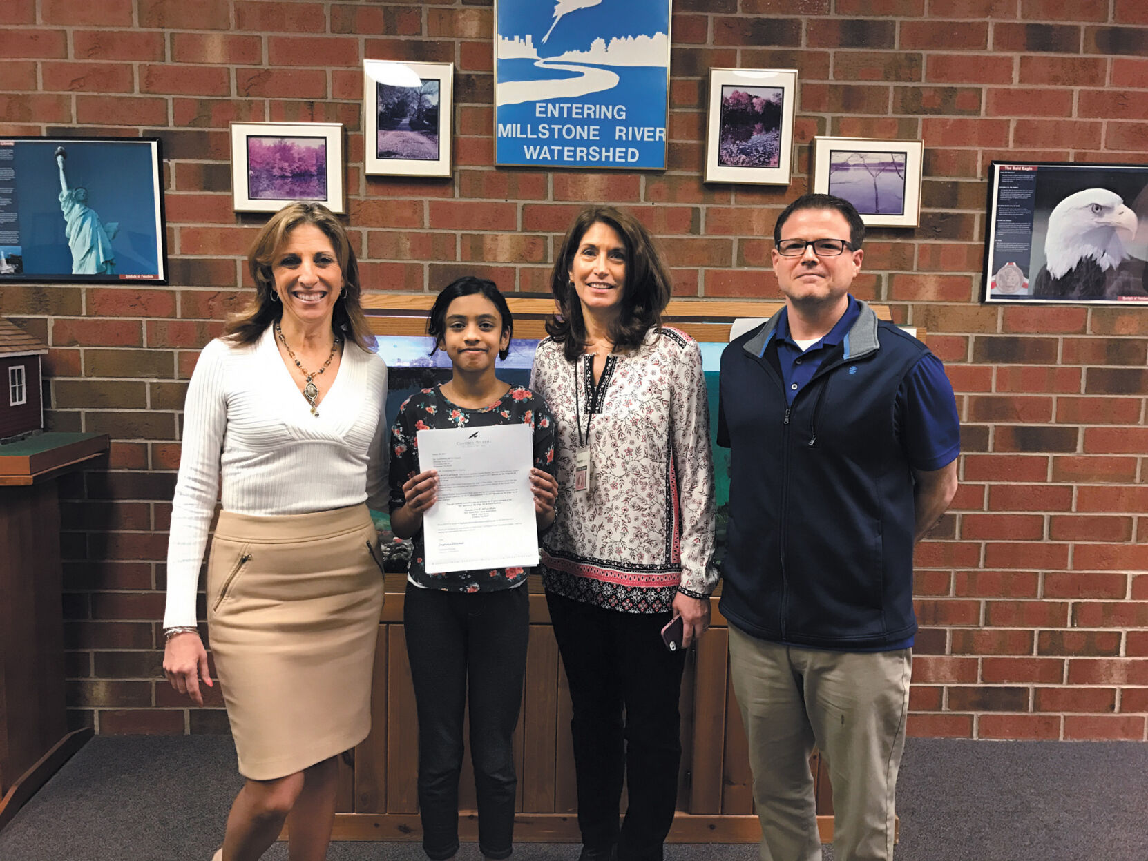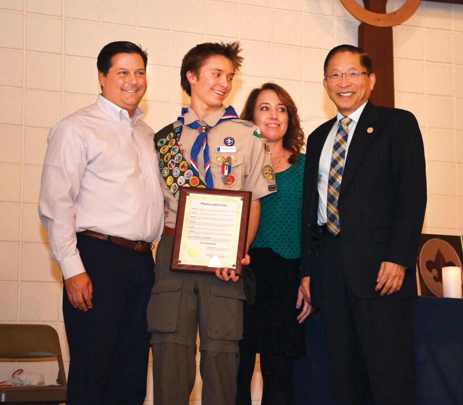 West Windsor Myor Shing-Fu Hsueh on March 4, 2017 presented Boy Scouts Alexander Petri and David Churinskas with proclamations for achieving the rank of Eagle Scout. Above is Petri with his parents, Muriel and David, and Hsueh.,