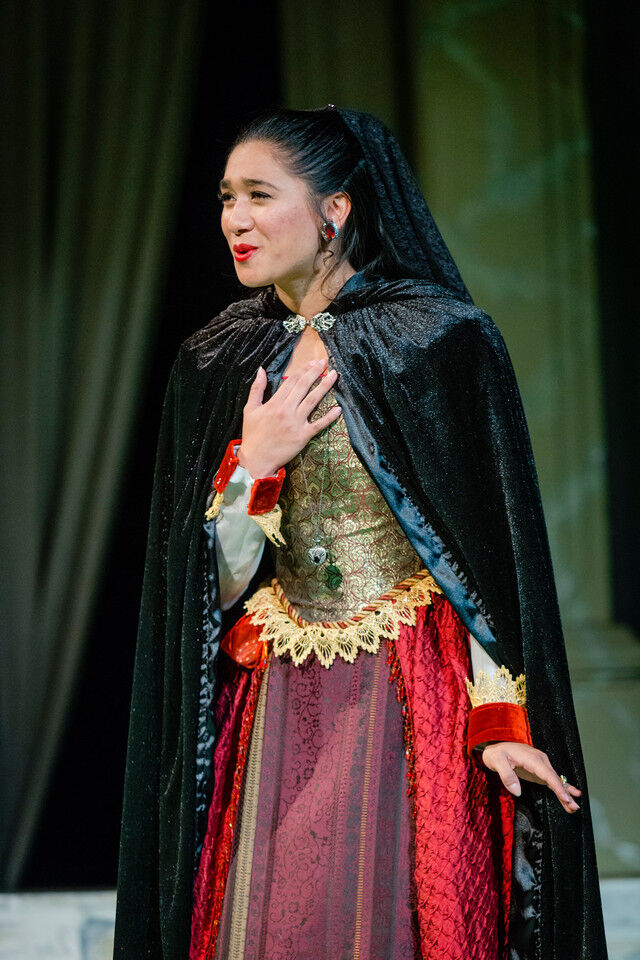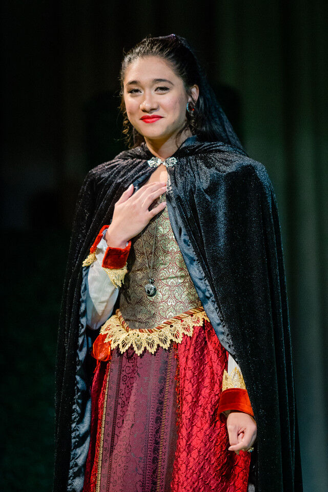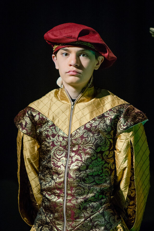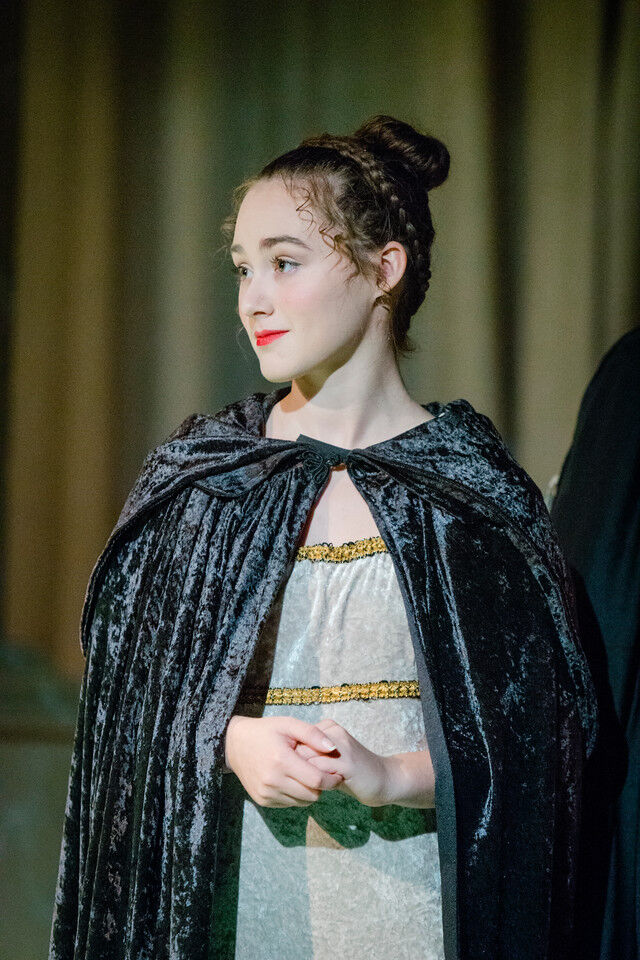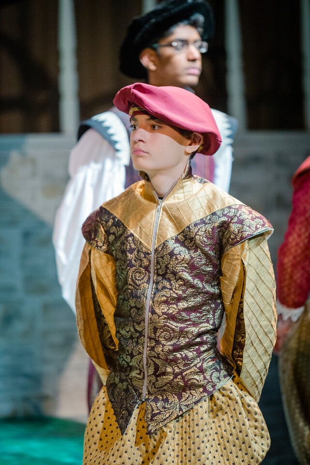 Brendan Roy as Curio, Grant Anderson as Valentine, and Andrew Lenart, Shreya Ragavan and Vijay Jayaraman as Count Orsino’s attendants (with Cathy Li, as one of a trio of musicians). Seated are Isabel Bannon as Cesario and Josh Goldhammer as Count Orsino.,