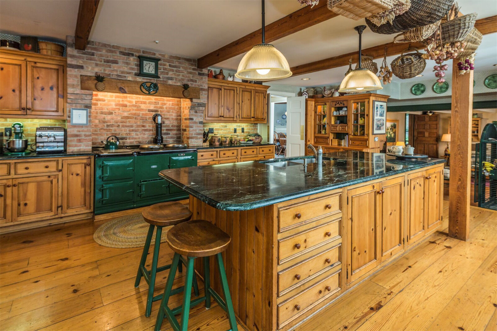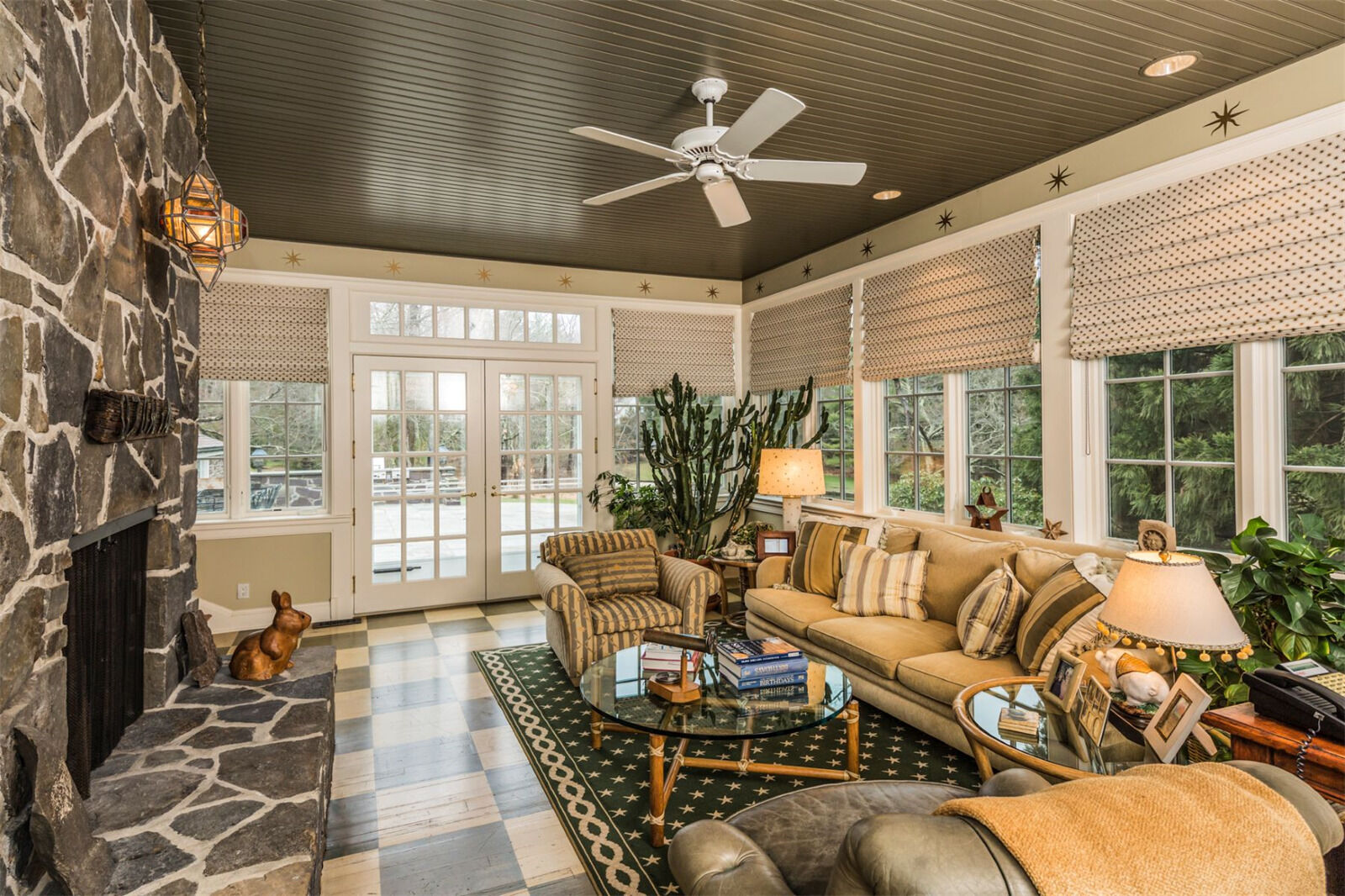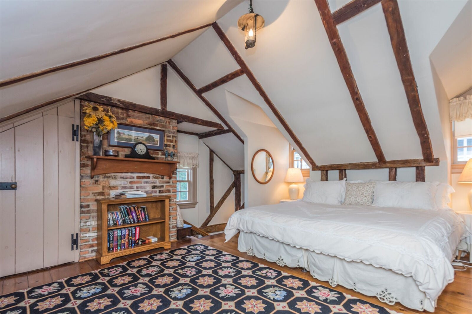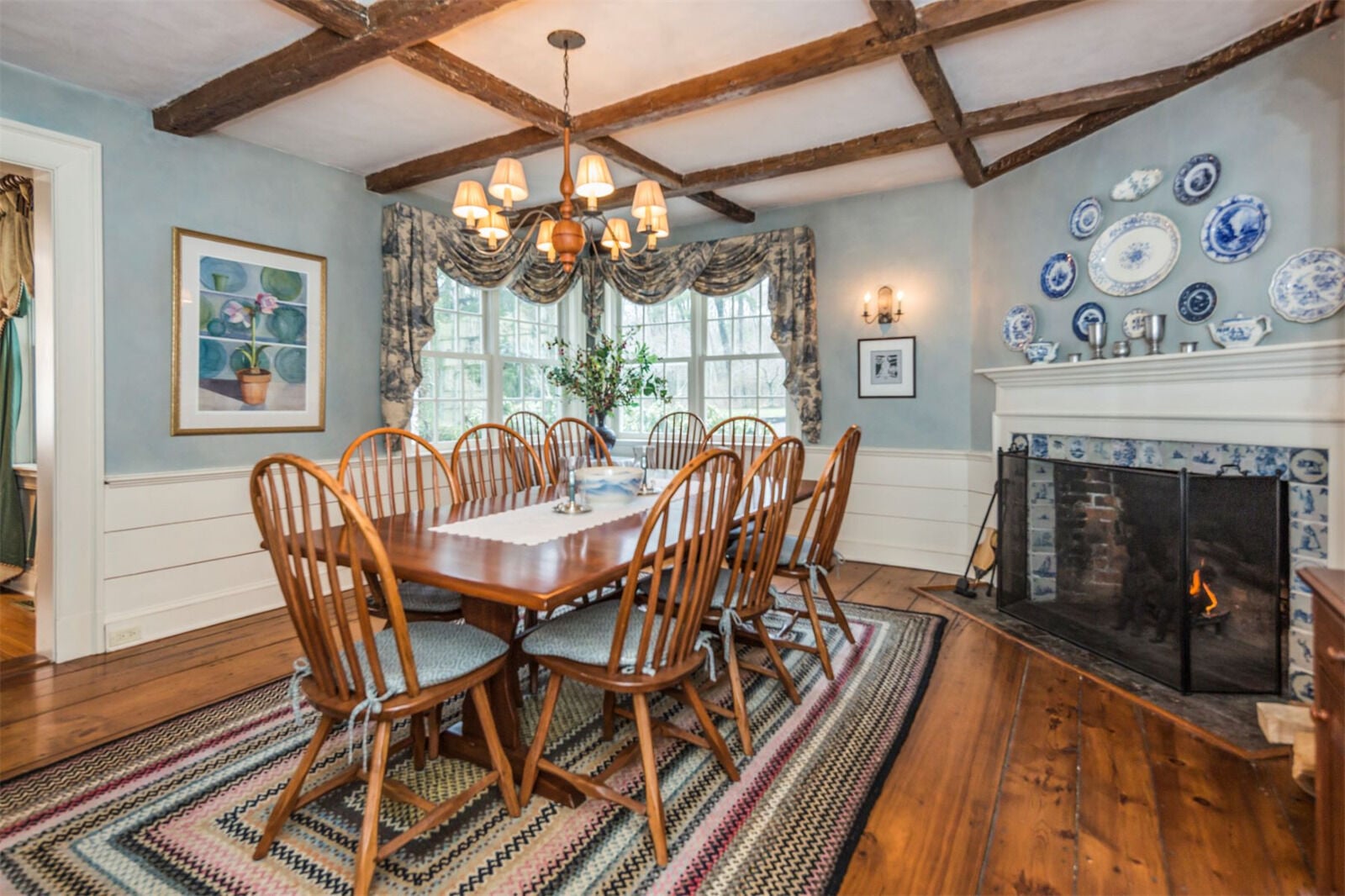 According to the Callaway Henderson SIR listing, this home was built in 1772 by a Dutch farmer. It was a homestead during George Washington’s occupation of Princeton, and in 1991 it was renovated to preserve the original details—hand-hewn beams, pine flooring, a walk-in Beehive fireplace, stone steps leading to a study and half bath that once housed horses, and a wood-burning fireplace surrounded by period Delft tiles.