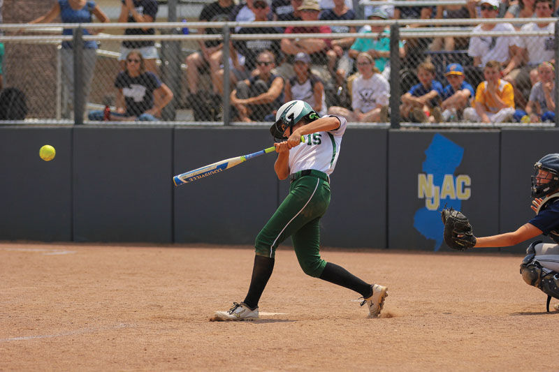 Steinert High’s Carli Backlund hits the ball during the New Jersey Group III championship against South Plainfield at Kean University June 11, 2016. The Spartans won, 6-2. (Photo by Amanda Ruch.),